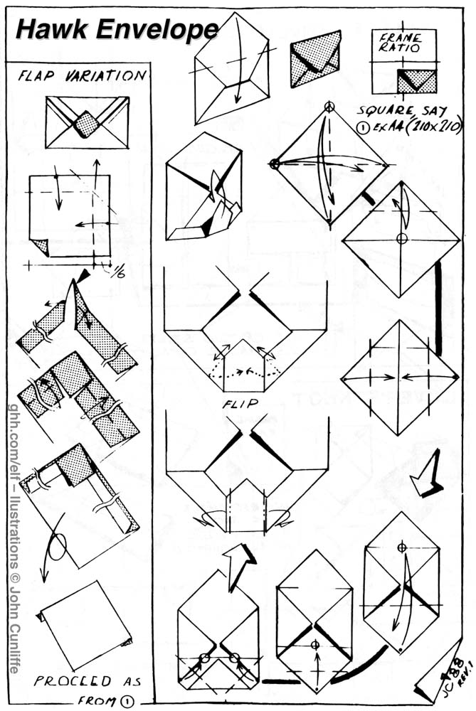 Hawk Envelope – Hiroshi Kumasaka. Made from a square sheet of paper. Loose flap must be glued down to seal. Adapted from a fold attributed to Hiroshi Kumasaka (from whose initials its name is taken), OKK vol. 4, ’80, Nippon Origami Association magazine (Japanese Origami Society) vol. 2, Japanese publication. Heart shape can be formed on tip of flap thus producing a Valentine envelope. Compare Kumasaka version.